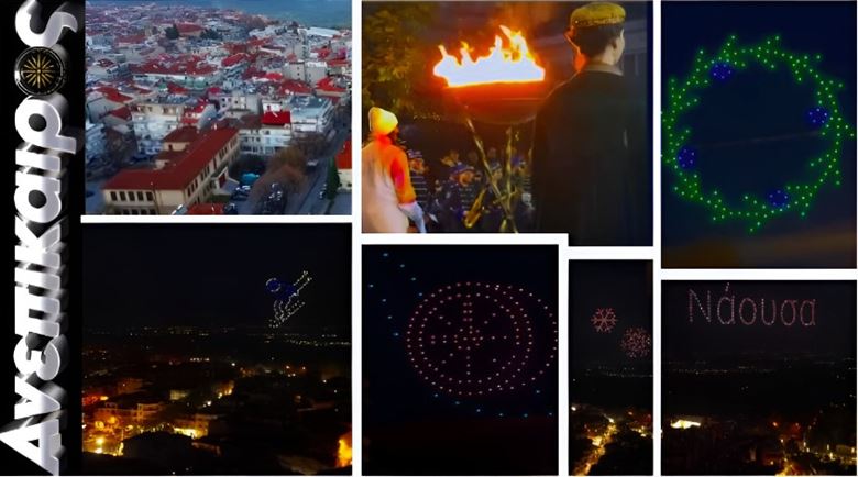 Ένα ουράνιο θέαμα με drones Αμέσως μετά την τελετή, ο ουρανός της Νάουσας γέμισε φως, χρώμα και κίνηση μέσα από ένα εντυπωσιακό Drone Light Show. Δεκάδες φωτεινά drones σχημάτισαν εικόνες και σύμβολα, δημιουργώντας ένα μαγευτικό θέαμα που καθήλωσε μικρούς και μεγάλους.