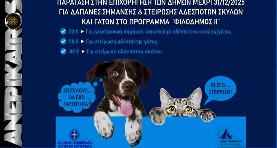 📍 Οι Δήμοι της χώρας, με απόφαση του Υπουργού Εσωτερικών, χρηματοδοτούνται εκ νέου με σκοπό την διενέργεια σημάνσεων και στειρώσεων στα αδέσποτα ζώα της χωρικής τους αρμοδιότητας.