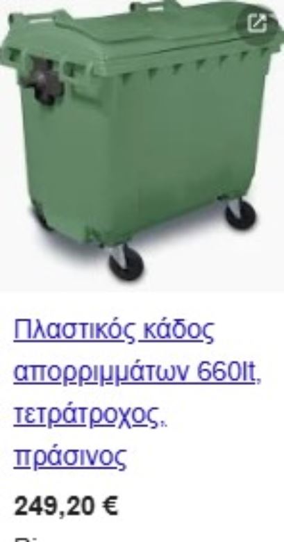 Το κόστος ανέρχεται σε 36.790 € για κάθε ενότητα, με το συνολικό ποσό να φτάνει περίπου τις 147.000 €. Με μια απλή έρευνα στην αγορά, οι τιμές των μεγάλων κάδων κυμαίνονται γύρω στα 250 €, ενώ οι μικρότεροι κοστολογούνται περίπου στα 80 €.