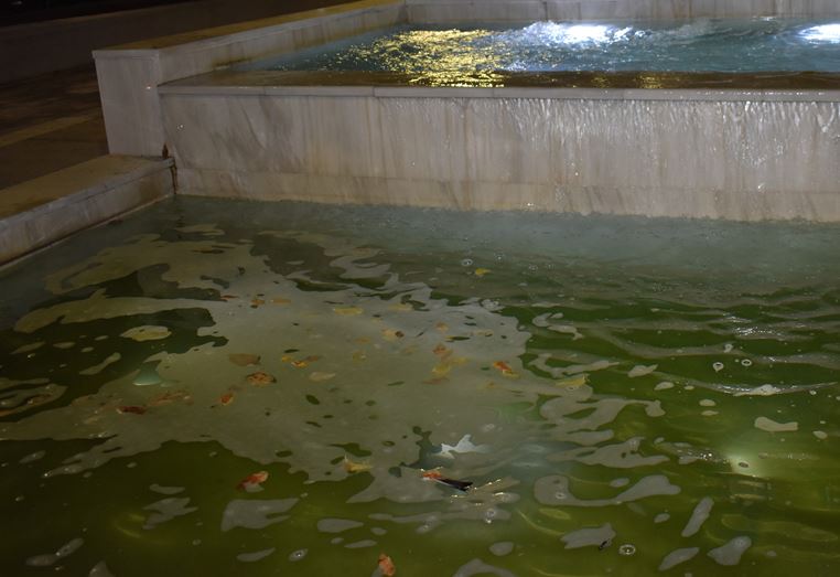 Εκεί, το νερό που τρέχει θυμίζει περισσότερο βιολογικό πείραμα παρά αστικό στολίδι. Η βρωμιά του είναι ανεξήγητη, ειδικά αν σκεφτεί κανείς πως το συντριβάνι είναι ολοκαίνουργιο και το νερό τρεχούμενο. Πώς γίνεται να μαζεύει σκουπίδια αφού τρέχει; Ούτε η επιστήμη το εξηγεί.