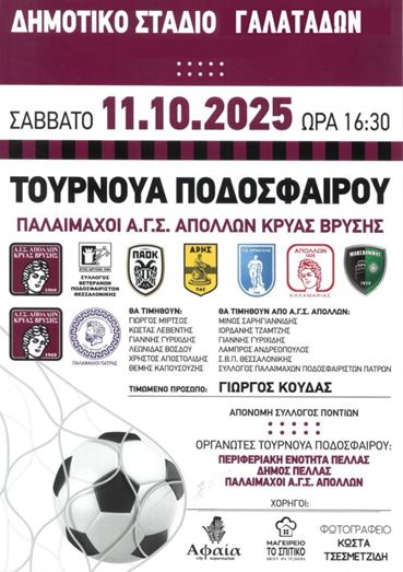 Το Σάββατο 11 Οκτωβρίου 2025, το Δημοτικό Στάδιο Γαλατάδων φιλοξενεί ένα ξεχωριστό τουρνουά ποδοσφαίρου, αφιερωμένο στη μνήμη και την προσφορά των παλαιμάχων του ελληνικού ποδοσφαίρου.