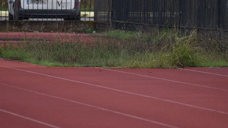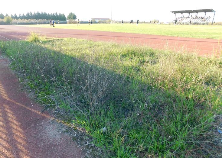 Κι όμως, το σκάμμα για άλματα θυμίζει οτιδήποτε άλλο εκτός από αθλητική εγκατάσταση: τα χόρτα έχουν καλύψει κάθε ίχνος άμμου.