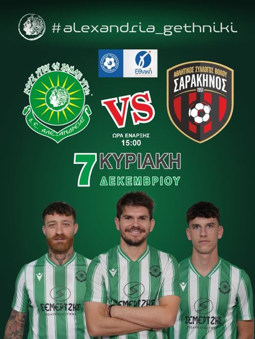 Η ΑΕ Αλεξάνδρειας επιστρέφει στη δράση την Κυριακή 7 Δεκεμβρίου, με έναν κρίσιμο αγώνα απέναντι στον Σαρακηνό Βόλου, στο πλαίσιο της έναρξης του 2ου γύρου του 2ου ομίλου της Γ’ Εθνικής Κατηγορίας.