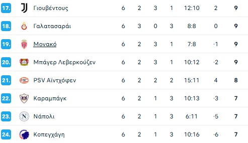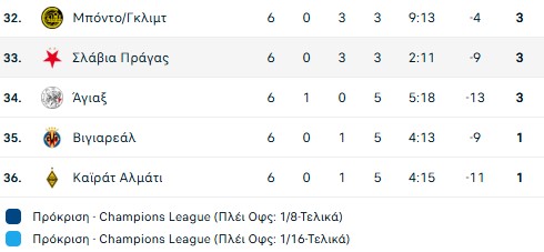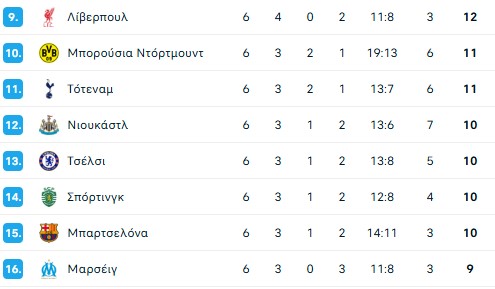 Στην 29η θέση της βαθμολογίας βρέθηκε ο Ολυμπιακός μετά την ολοκλήρωση της 6ης αγωνιστικής του Champions League, στην οποία έλαμψε η Μάντσεστερ Σίτι με τη νίκη της επί της Ρεάλ στη Μαδρίτη.
