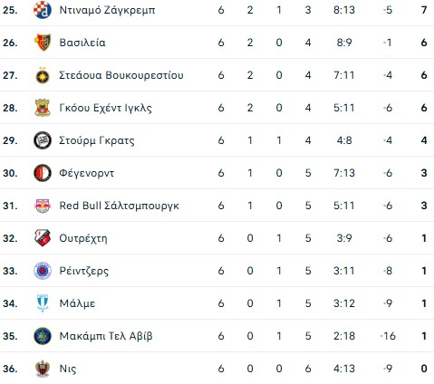 Δείτε πως διαμορφώθηκε η βαθμολογία της League Phase του Europa League μετά την ολοκλήρωση της 6ης αγωνιστικής και τις ισοπαλίες του Παναθηναϊκού και του ΠΑΟΚ