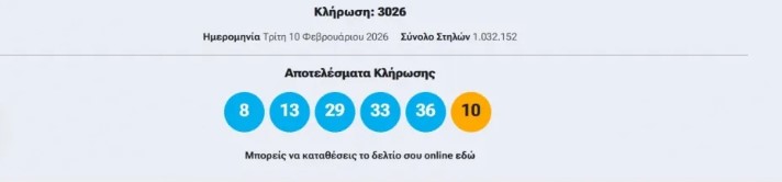 Πραγματοποιήθηκε το βράδυ της Τρίτης (10/2) η κλήρωση 3026 του Τζόκερ που μοιράζει στην πρώτη κατηγορία τουλάχιστον 1.000.000 ευρώ.