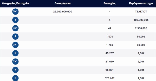 Βρέθηκαν επίσης 4 τυχερά δελτία με 5 επιτυχίες, που κερδίζουν από 100.000 ευρώ, ενώ 44 δελτία με 4+1 επιτυχίες κέρδισαν από 2.500 ευρώ.