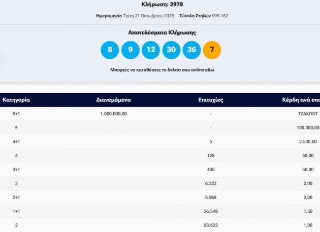 Πραγματοποιήθηκε το βράδυ της Πέμπτης (23/10) η κλήρωση 2978 του Τζόκερ που μοιράζει στην πρώτη κατηγορία ένα εκατομμύριο ευρώ.