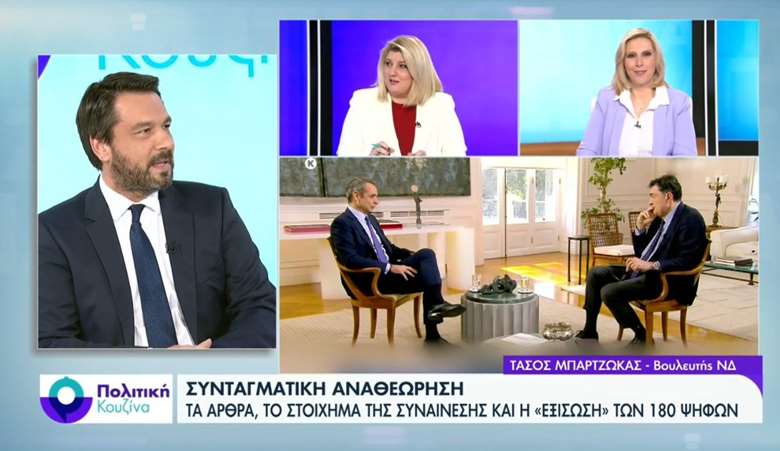Στην εκπομπή «Πολιτική Κουζίνα» του ERTNEWS, με τη Γεωργία Σκιτζή και τη Γεωργία Σαδανά, φιλοξενήθηκε ο Βουλευτής Ημαθίας της Νέας Δημοκρατίας Τάσος Μπαρτζώκας, ο οποίος τοποθετήθηκε για τις πολιτικές εξελίξεις, την κυβερνητική πορεία από το 2019 έως σήμερα και τις προτεραιότητες της επόμενης περιόδου.