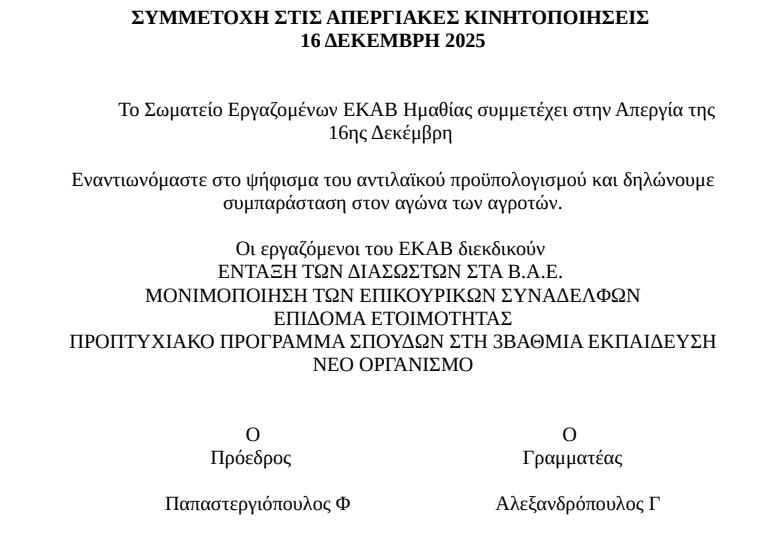 Το Σωματείο Εργαζομένων ΕΚΑΒ Ημαθίας συμμετέχει στην Απεργία της 16ης Δεκέμβρη