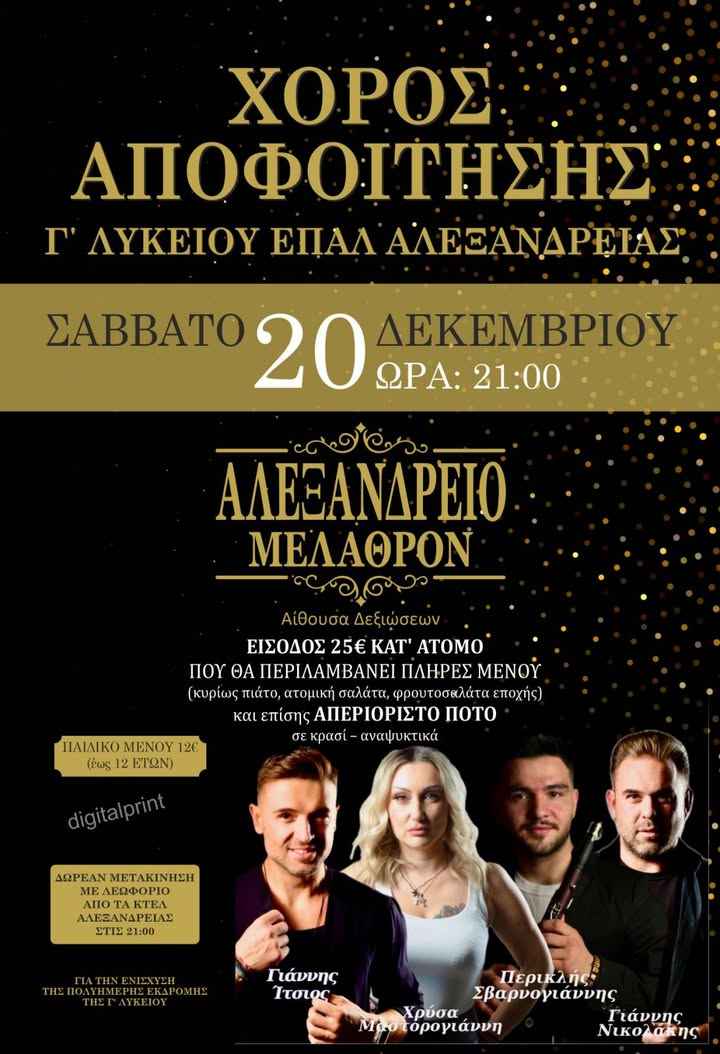 Η Γ΄Λυκείου του ΕΠΑΛ Αλεξάνδρειας καλεί όλο τον κόσμο στον χορό αποφοίτησης σήμερα Σάββατο 20 Δεκεμβρίου 2025