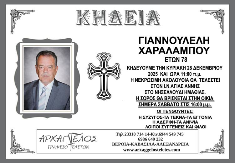 Η κηδεία του Γιαννουλέλη Χαράλαμπου στο Νησελούδι Ημαθίας την Κυριακή 28 Δεκεμβρίου 2025