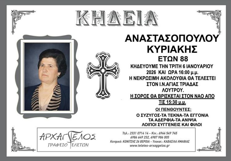 Κηδεία της Αναστασοπούλου Κυριακής στο Λουτρό Ημαθίας την Τρίτη 6 Ιανουαρίου 2026