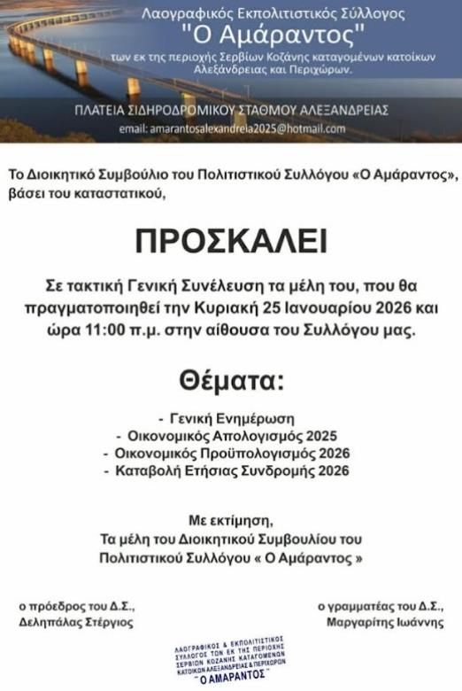 Τακτική Γενική Συνέλευση του συλλόγου ''Ο Αμάραντος'' την Κυριακή 25 Ιανουαρίου 2026