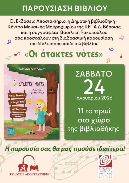Οι Εκδόσεις Αποστακτήριο, η Δημοτική βιβλιοθήκη - Κέντρο Μουσικής Μακροχωρίου και η συγγραφέας Βασιλική Ρακοπούλου σάς προσκαλούν στη διαδραστική παρουσίαση του δίγλωσσου παιδικού βιβλίου «Οι άτακτες νότες» το Σάββατο 24 Ιανουαρίου 2026 στις 11 το πρωί στο χώρο της βιβλιοθήκης (Αριστοτέλους 100, Μακροχώρι Ημαθίας).
