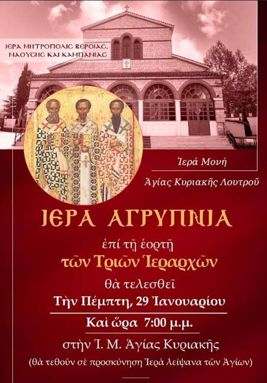 Ιερά Αγρυπνία για την Εορτή των Τριών Ιεραρχών θα τελεσθεί στην Ιερά Μονή Αγίας Κυριακής Λουτρού, την Πέμπτη 29 Ιανουαρίου 2026, από 19:00 έως 00:15.