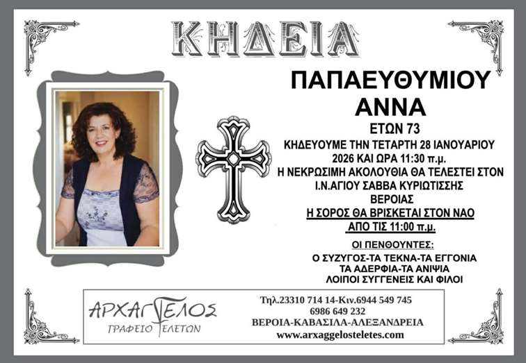 Η κηδεία της Παπαευθυμίου Άννας την Τετάρτη 28 Ιανουαρίου 2026