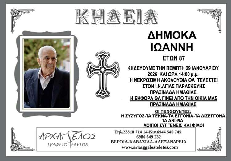 Η κηδεία του Δημόκα Ιωάννη στην Πρασινάδα Ημαθίας την Πέμπτη 29 Ιανουαρίου 2026
