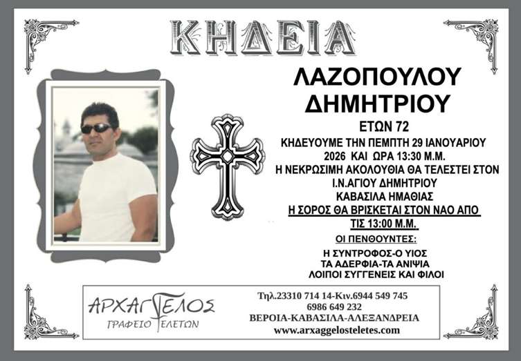 Η κηδεία του Λαζόπουλου Δημητρίου στα Καβάσιλα ημαθίας την Πέμπτη 29 Ιανουαρίου 2026.