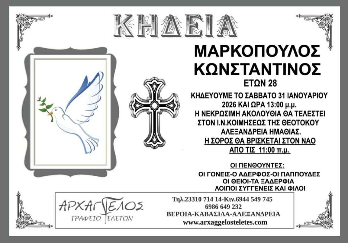 Οι κηδείες των Πάλο Βασίλη, Μαρωνίτη Δημήτριου και Μαρκόπουλου Κωνσταντίνου στην Αλεξάνδρεια το Σάββατο 31 Ιανουαρίου 2026