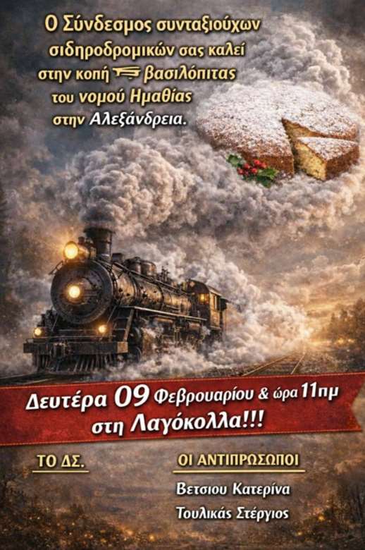 Ο Σύνδεσμος Συνταξιούχων Σιδηροδρομικών Ν. Ημαθίας σας καλεί στην κοπή βασιλόπιτας.