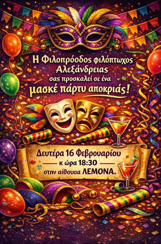 Η Φιλοπρόοδος Φιλόπτωχος Γυναικών Αλεξάνδρειας σας προσκαλεί στο μασκέ πάρτυ.