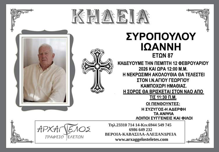 Η κηδεία του Συρόπουλου Ιωάννη στο Καμποχώρι Ημαθίας την Πέμπτη 12 Φεβρουαρίου 2026