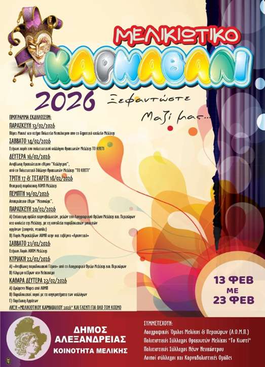 Πρόγραμμα εκδηλώσεων για το Μελικιώτικο Καρναβάλι 2026 (13 με 23 Φεβρουαρίου)