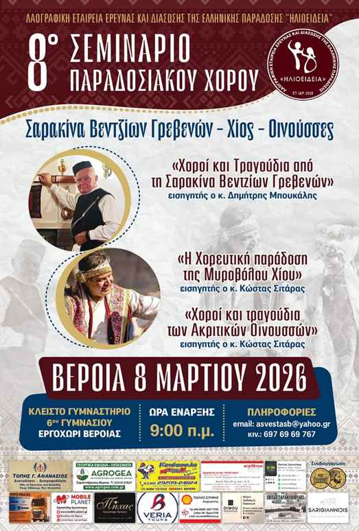 Με συνέπεια και βαθιά γνώση, διοργανώνει στη Βέροια ένα μεγάλο σεμινάριο παραδοσιακού χορού, αφιερωμένο σε τρεις ιδιαίτερες εστίες του ελληνικού πολιτισμού: τη Σαρακίνα Βεντζίων Γρεβενών, τη Μυροβόλο Χίο και τις Ακριτικές Οινούσσες.