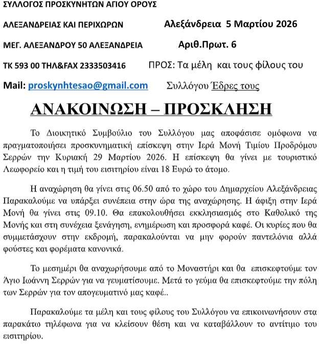 Προσκυνηματική επίσκεψη την Κυριακή 29 Μαρτίου 2026 στην ΙΜ Τιμίου Προδρόμου Σερρών από τον Σύλλογο Προσκυνητών Αγίου Όρους.