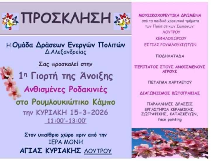 Στις 15 Μαρτίου η 1η γιορτή Άνοιξης στον Ρουμλουκιώτικο κάμπο. Στον υπαίθριο χώρο στην Αγία Κυριακή