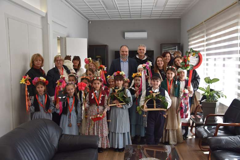 Στο πλαίσιο των δράσεών τους, τα παιδιά περιηγήθηκαν στους δρόμους της πόλης τραγουδώντας τα παραδοσιακά κάλαντα της άνοιξης και στη συνέχεια επισκέφθηκαν το Δημαρχείο Νάουσας, όπου τους υποδέχθηκε ο Δήμαρχος Ηρωικής Πόλεως Νάουσας κ. Νικόλαος Κουτσογιάννης.