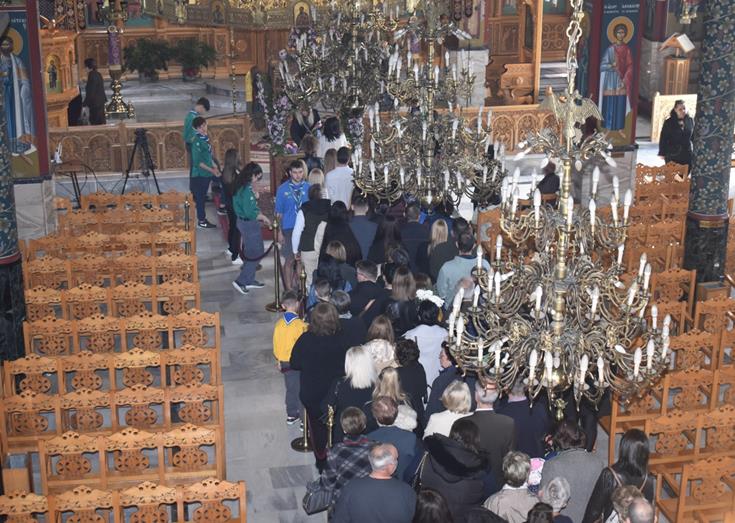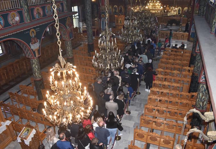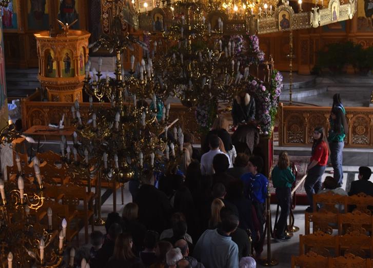 Στην καρδιά της πόλης, η μεγαλοπρεπής εκκλησία της Παναγίας Θεοτόκου γέμισε από νωρίς με κόσμο κάθε ηλικίας. Οι πιστοί, με ταπεινότητα, προσέρχονταν για να ασπαστούν τον ανθοστόλιστο επιτάφιο, σύμβολο της ταφής του Κυρίου, ψιθυρίζοντας προσευχές και εκφράζοντας τη βαθιά τους πίστη.