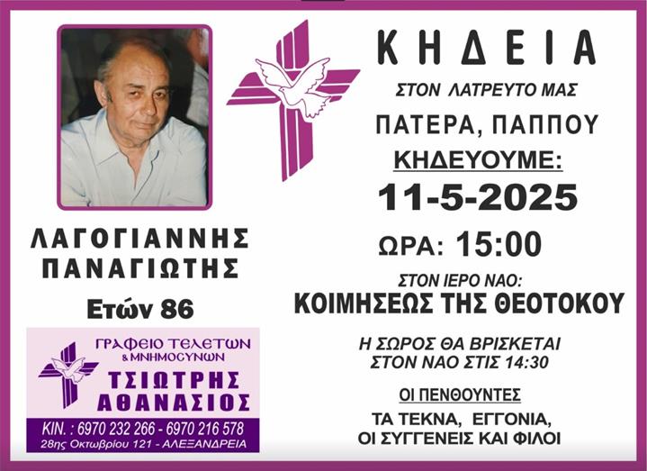 Με βαθιά θλίψη πληροφορηθήκαμε για τον θάνατο του Παναγιώτη Λαγογιάννη στην Αλεξάνδρεια.