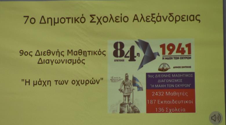Στην κατάμεστη αίθουσα του πνευματικού κέντρου της Αλεξάνδρειας, πραγματοποιήθηκε με μεγάλη επιτυχία η τελετή βράβευσης των μαθητών του 7ου Δημοτικού Σχολείου Αλεξάνδρειας που διακρίθηκαν σε διεθνείς διαγωνισμούς.
