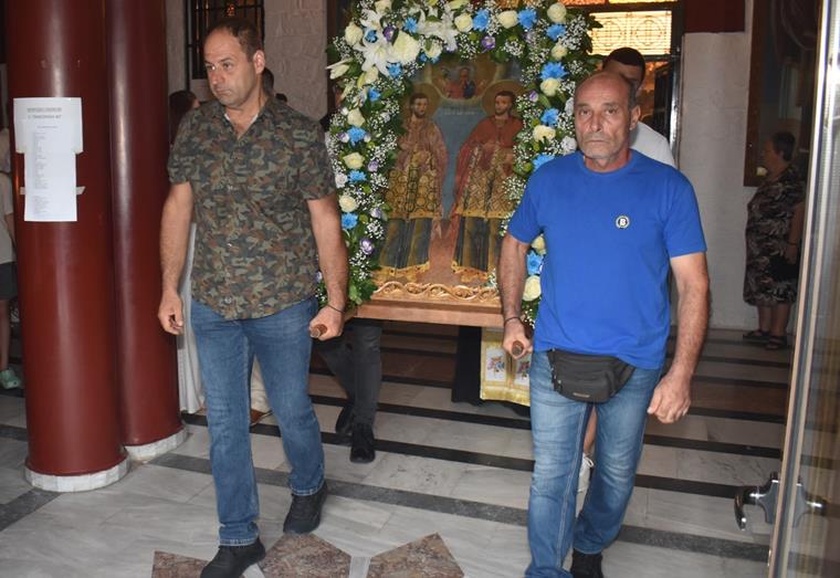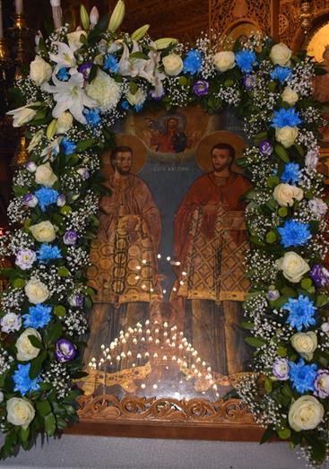 Πλήθος πιστών κατέκλυσε τον Ιερό Ναό για να τιμήσει τους θαυματουργούς Αγίους, σε μία ατμόσφαιρα κατάνυξης και θρησκευτικής ευλάβειας.