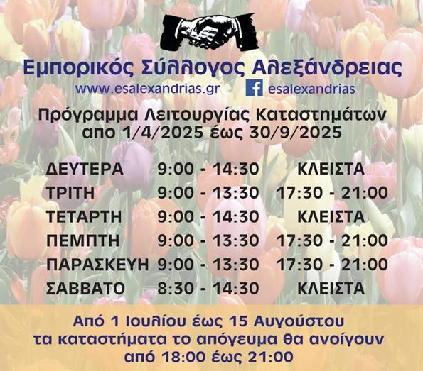 Εμπορικός Σύλλογος Αλεξάνδρειας. Αλλάζει το ωράριο καταστημάτων τις απογευματινές ώρες από 1 Ιουλίου έως 15 Αυγούστου