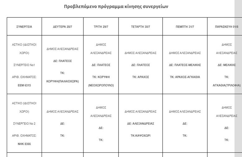 Προβλεπόμενο πρόγραμμα κίνησης συνεργείων