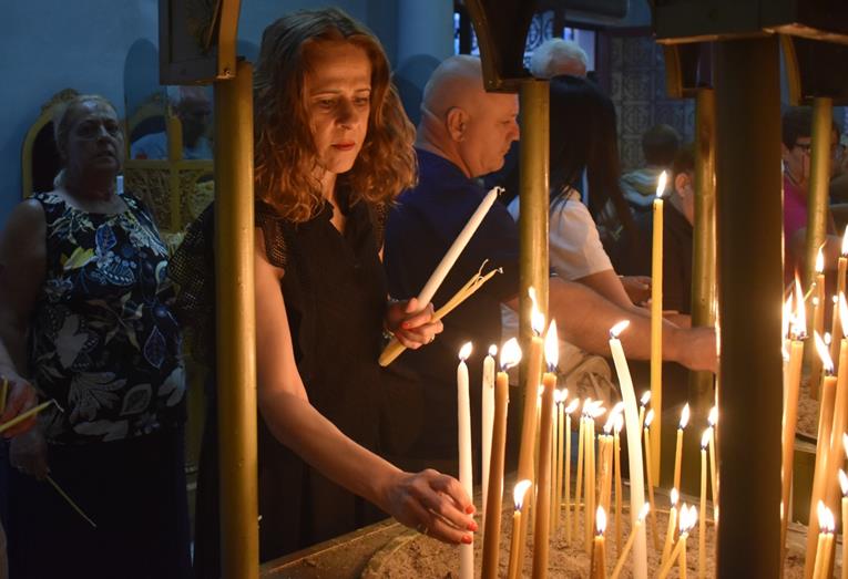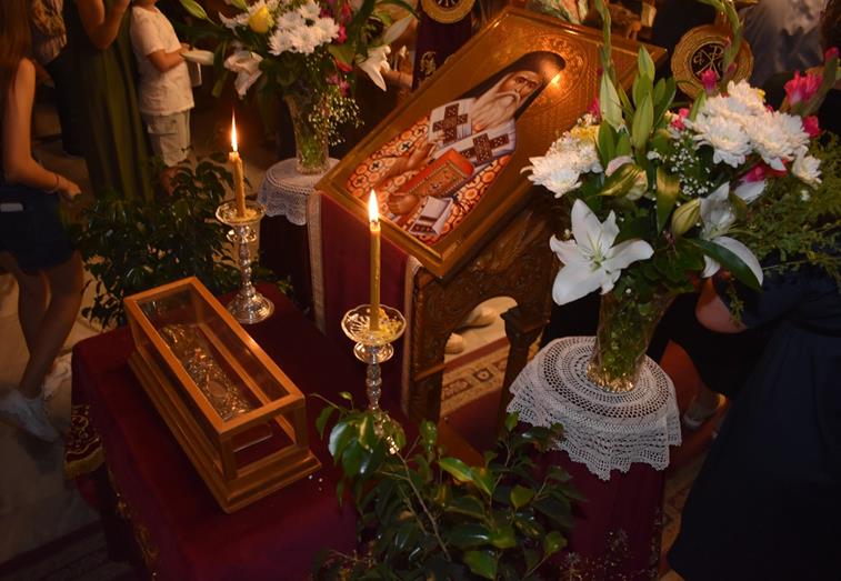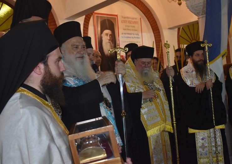 Στη διάρκεια του Πανηγυρικού Εσπερινού τέθηκε σε προσκύνηση η τιμία Χείρα του Αγίου Νεκταρίου Πενταπόλεως, που θησαυρίζεται στην Αίγινα και βρίσκεται αυτές τις ημέρες στην Αλεξάνδρεια για προσκύνημα των πιστών.
