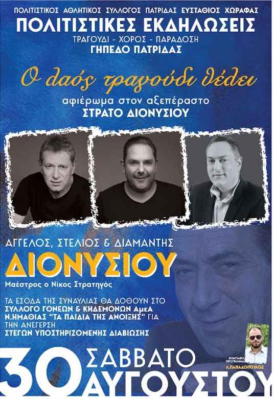 Μια ξεχωριστή μουσική βραδιά υπόσχονται τα αδέρφια Άγγελος, Στέλιος και Διαμαντής Διονυσίου, που θα ανέβουν στη σκηνή του γηπέδου Πατρίδας Ημαθίας την Παρασκευή 30 Αυγούστου, παρουσιάζοντας ένα πρόγραμμα αφιερωμένο στον αείμνηστο πατέρα τους, Στράτο Διονυσίου, αλλά και με τραγούδια από τη δική τους πορεία στο ελληνικό πεντάγραμμο.