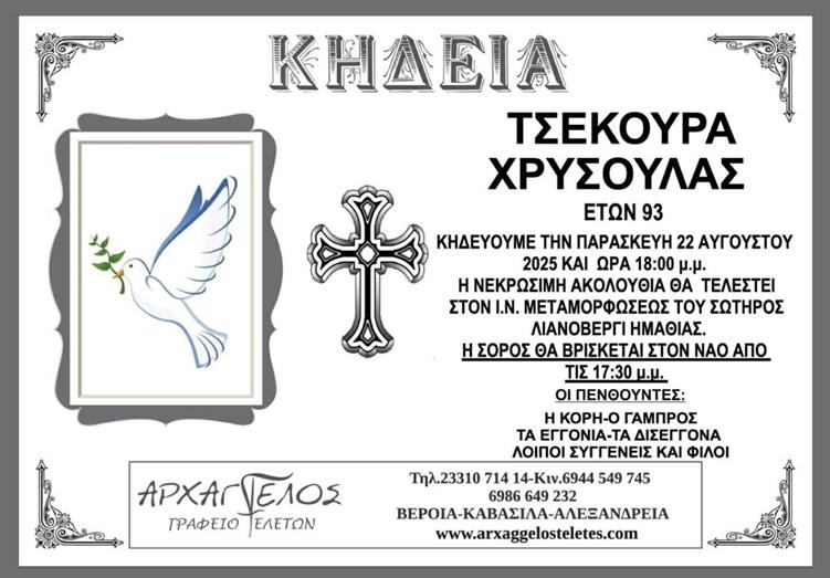 Η κηδεία της Τσεκούρα Χρυσούλας στο Λιανοβέργι Ημαθίας την Παρασκευή 22 Αυγούστου 2025
