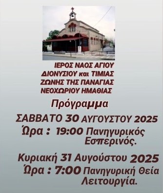 Πανηγυρίζει ο ΙΝ Αγίου Διονυσίου και Τιμίας Ζώνης της Παναγίας Νεοχωρίου Ημαθίας.