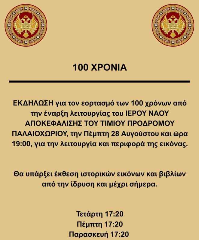 ΕΚΔΗΛΩΣΗ για τον εορτασμό των 100 χρόνων από την έναρξη λειτουργίας του ΙΕΡΟΥ ΝΑΟΥ ΑΠΟΚΕΦΑΛΙΣΗΣ ΤΟΥ ΤΙΜΙΟΥ ΠΡΟΔΡΟΜΟΥ ΠΑΛΑΙΟΧΩΡΙΟΥ, την Πέμπτη 28 Αυγούστου και ώρα 19:00, για την λειτουργία και περιφορά της εικόνας.