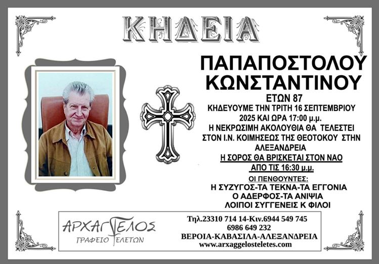 Η κηδεία του Παπαποστόλου Κωνσταντίνου στην Αλεξάνδρεια την Τρίτη 16 Σεπτεμβρίου 2025