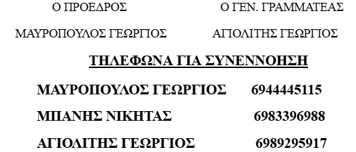 Παρακαλούμε τα μέλη και τους φίλους του Συλλόγου να επικοινωνήσουν στα παρακάτω τηλέφωνα, για να κλείσουν θέση και να καταβάλλουν το αντίτιμο του εισιτηρίου.