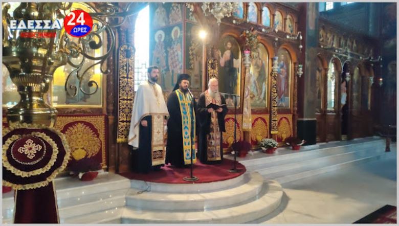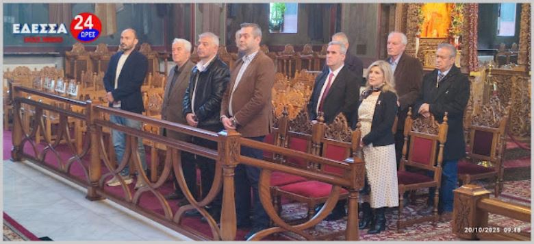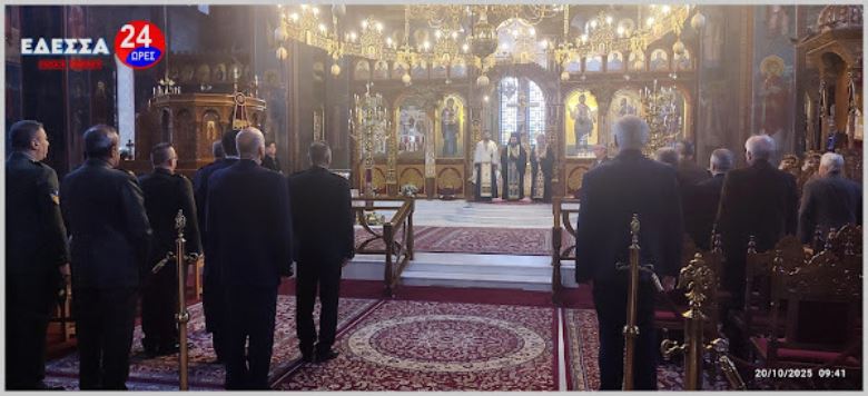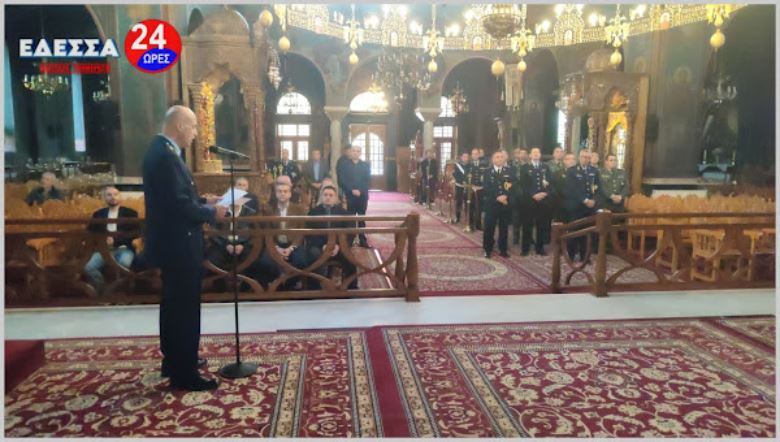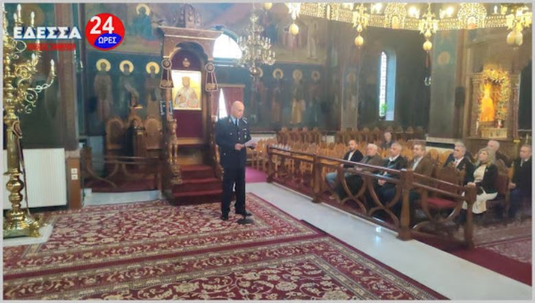 Το πρωί στις 10.00 πμ τελέστηκε Δοξολογία στον Ιερό Ναό Αγίας Σκέπης, παρουσία του Αστυν. Διευθυντή Υποδιευθυντή της Δ/νσης Αστυνομίας Πέλλας Ανδρέου Ιωάννη, Διοικητών Αξιωματικών και Αστυνομικών από όλα τα Τμήματα του Ν. Πέλλας, του Δημάρχου Έδεσσας Γιάννη Τσεπκεντζή, του Δημάρχου Αλμωπίας Νίκου Παρούτογλου, δημοτικών και περιφερειακών συμβούλων, Αξιωματικών της 2ας Μεραρχίας Πεζικού, Αξιωματικών της Π.Υ. Έδεσσας, Αποστράτων της Αστυνομίας και του Στρατού, του Δ/ντή Πρωτοβάθμιας Εκπ/σης Πέλλας και αρκετό κόσμο.