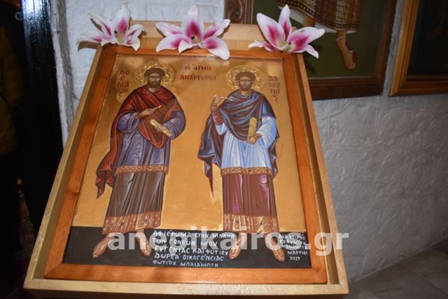 Με ιδιαίτερη κατάνυξη και τη συμμετοχή πλήθους πιστών τελέστηκε το απόγευμα της Παρασκευής 31 Οκτωβρίου ο Μέγας Πανηγυρικός Εσπερινός στον Ιερό Ναό Αγίων Αναργύρων στο Νησί Ημαθίας, τιμώντας τη μνήμη των δύο θαυματουργών Αγίων, Κοσμά και Δαμιανού.