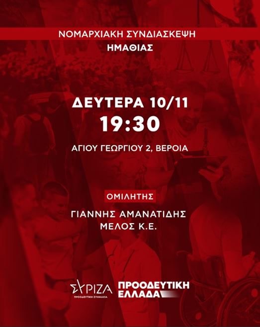 ΣΥΡΙΖΑ ΠΣ. Νομαρχιακή συνδιάσκεψη Ημαθίας την Δευτέρα 10 Νοεμβρίου 2025