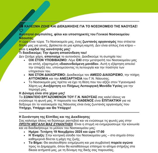 Κάλεσμα ζωής και διεκδίκησης για το νοσοκομείο της Νάουσας.