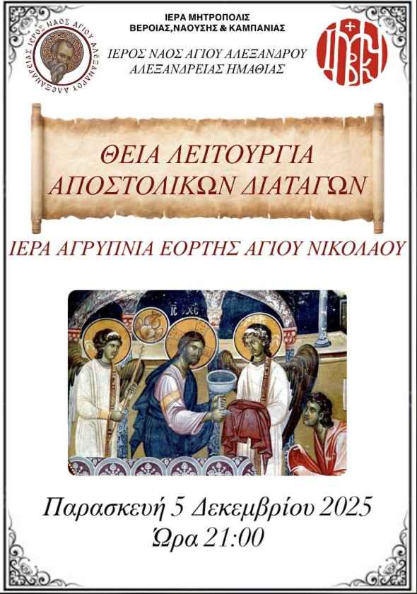 Ιερά Αγρυπνία εορτής Αγίου Νικολάου στον ΙΝ Αγίου Αλεξάνδρου στην Αλεξάνδρεια την Πέμπτη 6 Δεκεμβρίου 2025